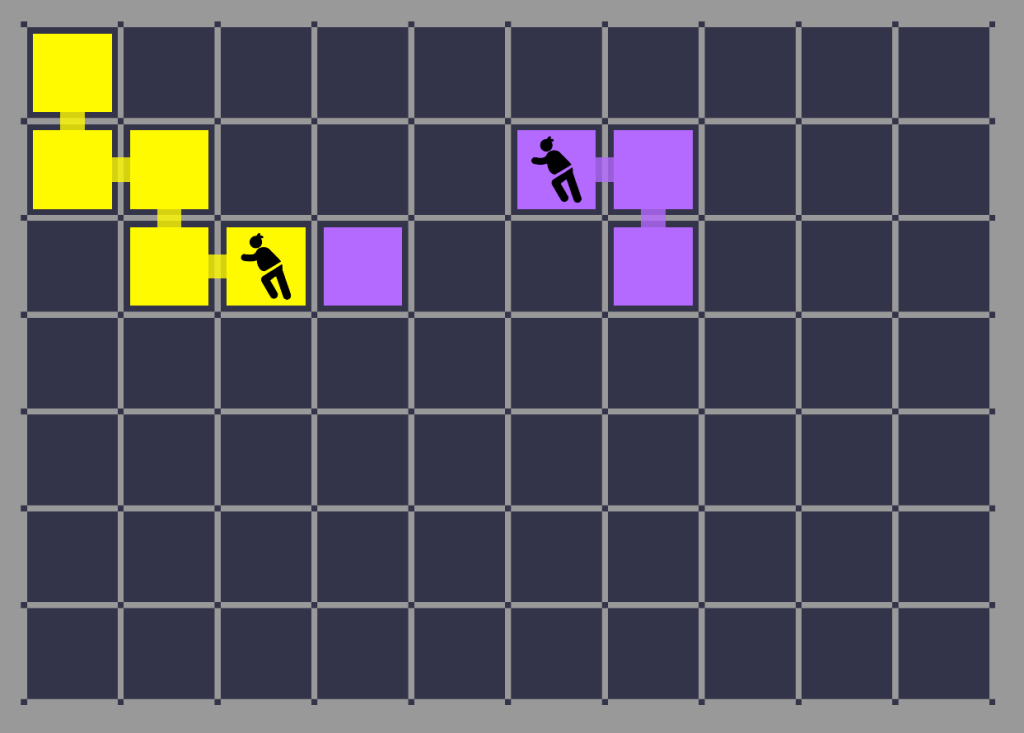 It’s easy enough to see what each program can do individually given the state of the grid, but of course the grid changes whenever a program moves. The script might determine that two of its programs could both attack one big player program to kill it, but after moving one of them, its trail of sectors gets in the way of the other program’s route, or when it attacks it removes the sector that the other program would have attacked.